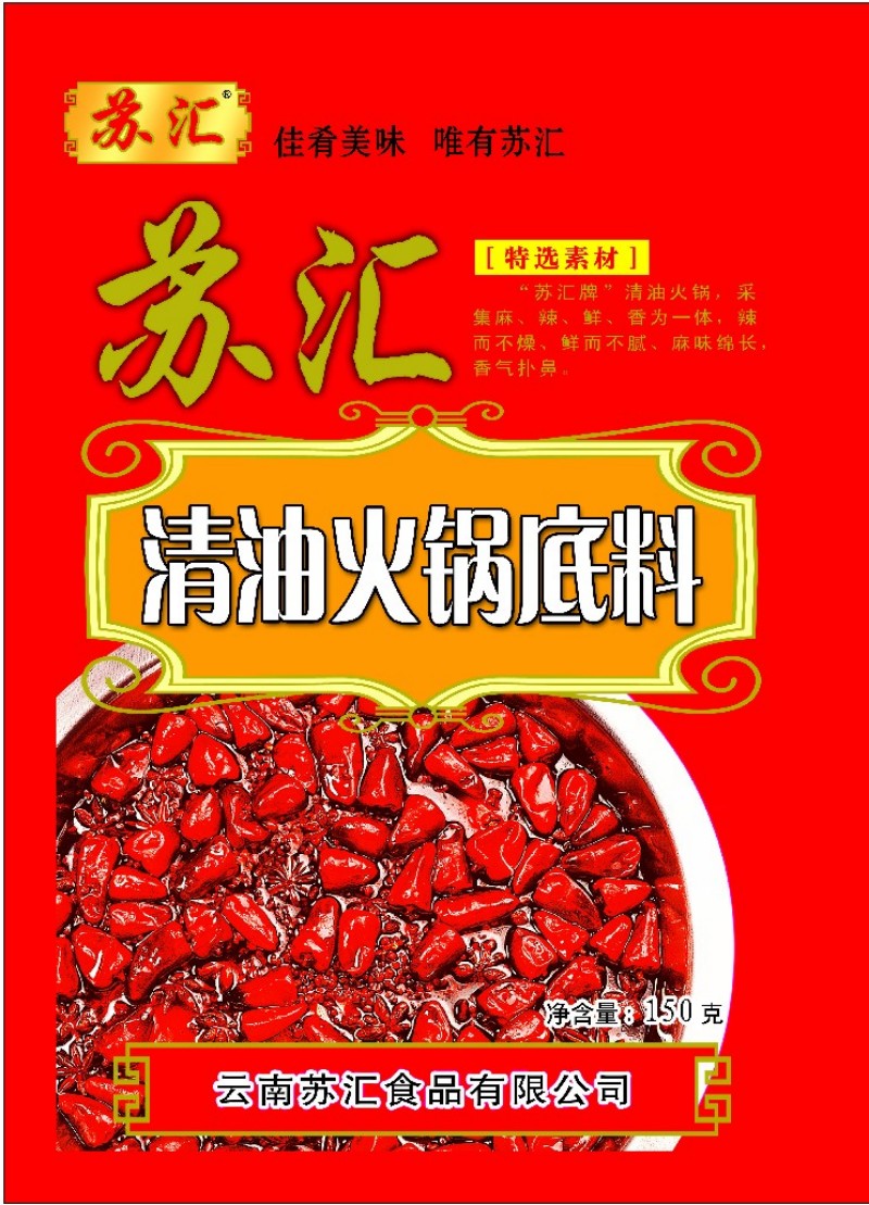 苏汇品牌,每袋 150 克,一箱 50 袋。以清油为基底,具有清爽口感,适合不适应牛油厚重感的人群,可搭配各类火锅食材。